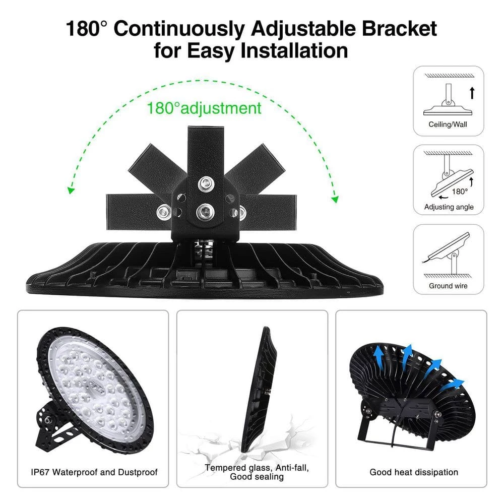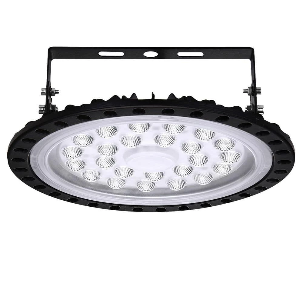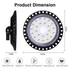 The LED lamps use high brightness LED chips. The UFO LED light features a beautiful appearance, high-pressure cast aluminum shell and there are many heat dissipation fins on the light shell, so the light features good heat dissipation effect. Compared with incandescent lamps and halogen lamps, it can save more than 85% of electric energy, and compared with high-pressure sodium lamps and HID bulbs, its service life is more than doubled.The light is easy to install, which can be hanging-mounted and wall-mounted, and the light is suitable for lighting in warehouses, garages, factory workshops, warehouse supermarkets, basements, exhibition halls, stadiums and other places.