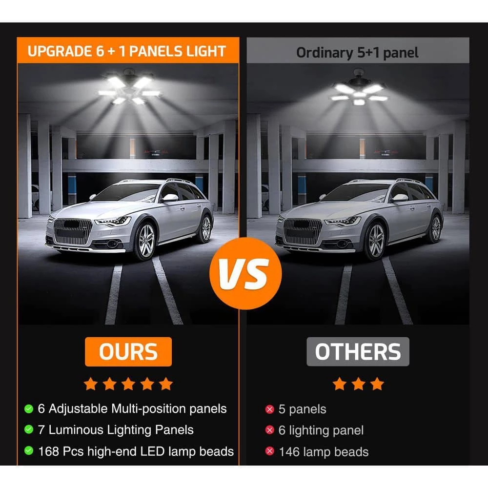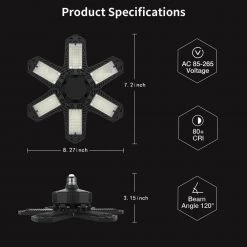 The garage light has 6 foldable LED lamp heads, unique wide-angle LED dimmable design, each wing is adjustable at 90° and can have a perfect garage lighting distribution curve according to your application. The product is light and compact, which can be quickly installed, saving time and effort. Suitable for small supermarkets, workshops, warehouses, storage rooms, etc.