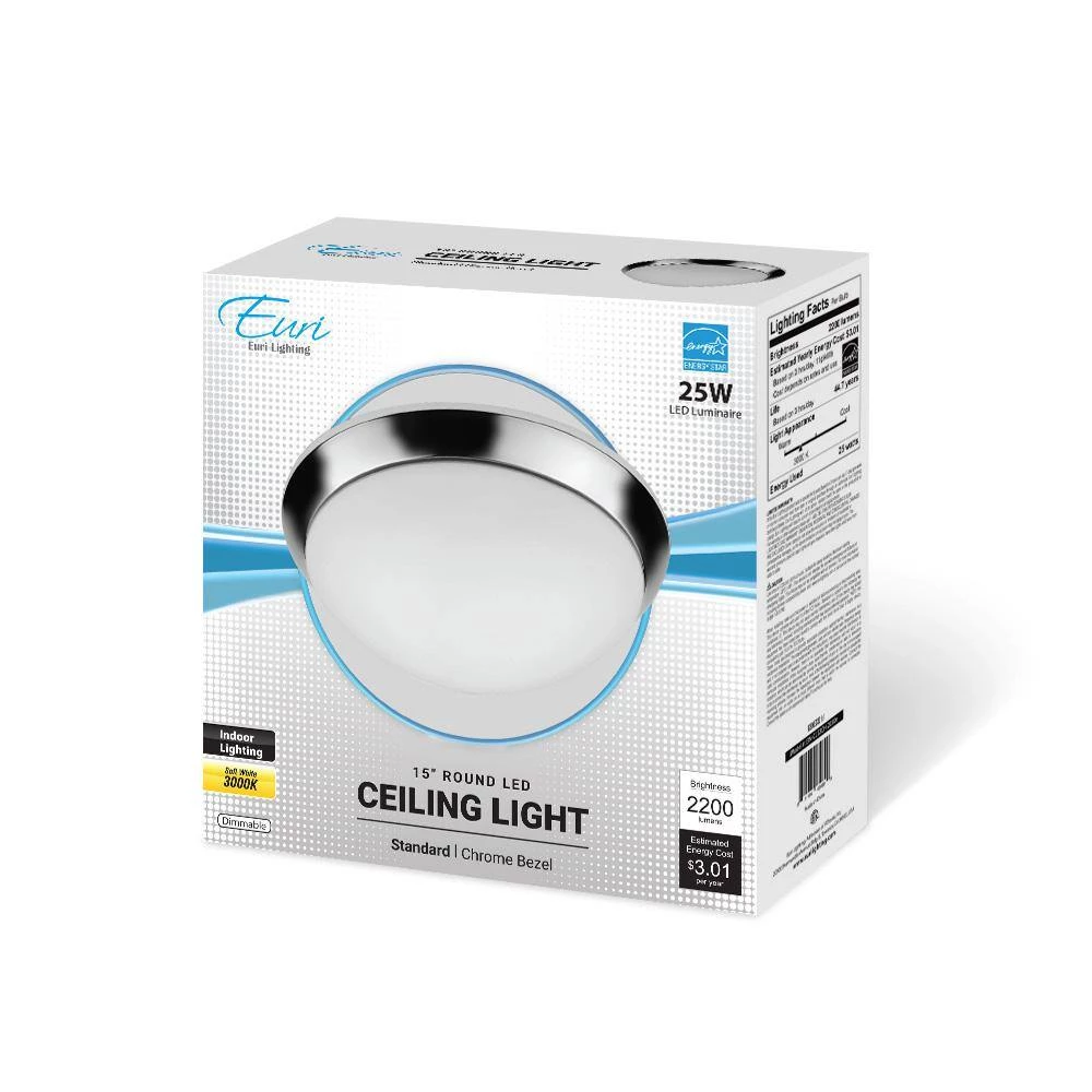 Pairing minimal-Watt with maximum Lumen, this Euri Lighting ceiling light delivers unbeatable illumination in Soft White (3000K). Chrome finish accents and a frosted glass lens make for a sleek silhouette, perfect for the kitchen, bedroom or hallway. Dimmable and guaranteed to last years, this 15 LED ceiling light saves energy with every switch on. For 13 size, see Euri Lighting EIN-CL31CH-2030e.