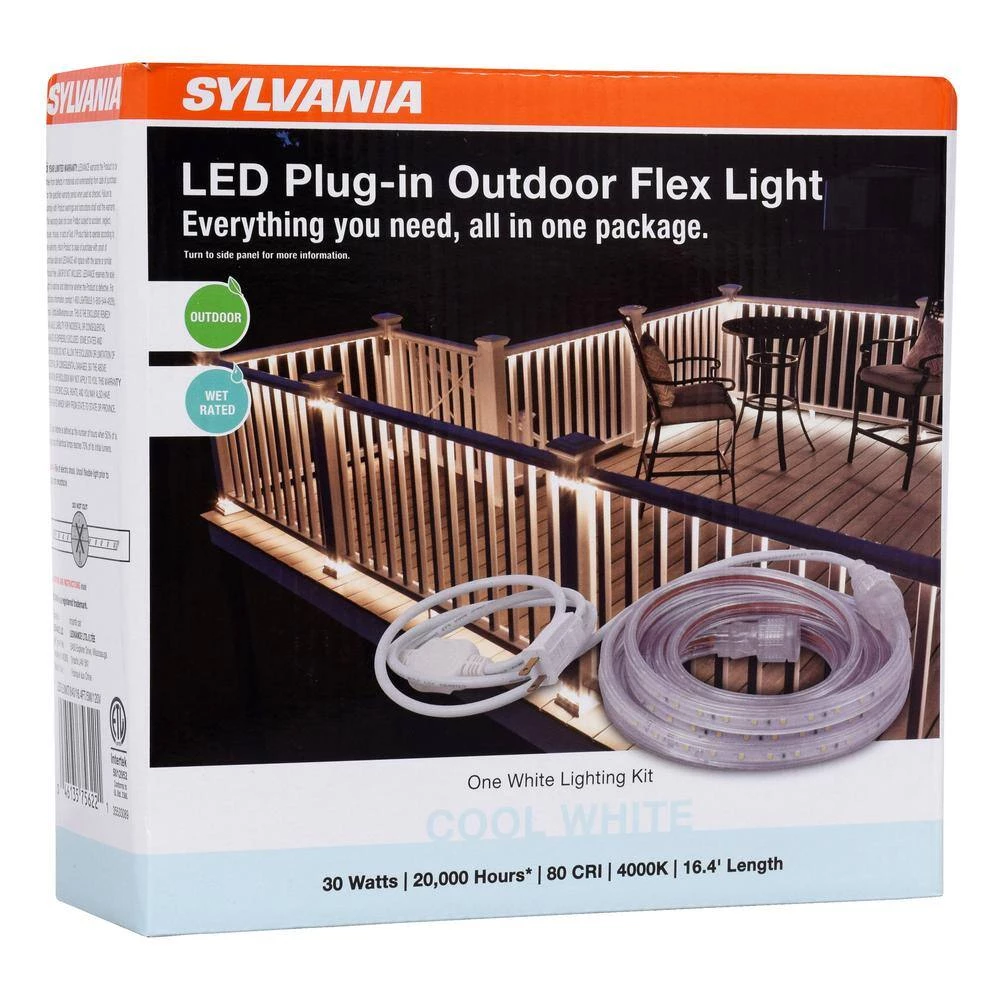 Sylvania LED Plug-In Outdoor Flex Light offers a complete solution for your lighting needs. Suitable for outdoor use year-round. The kit includes strip, AC power cord, clips and screws as well as a full guide to installation. Low power usage.