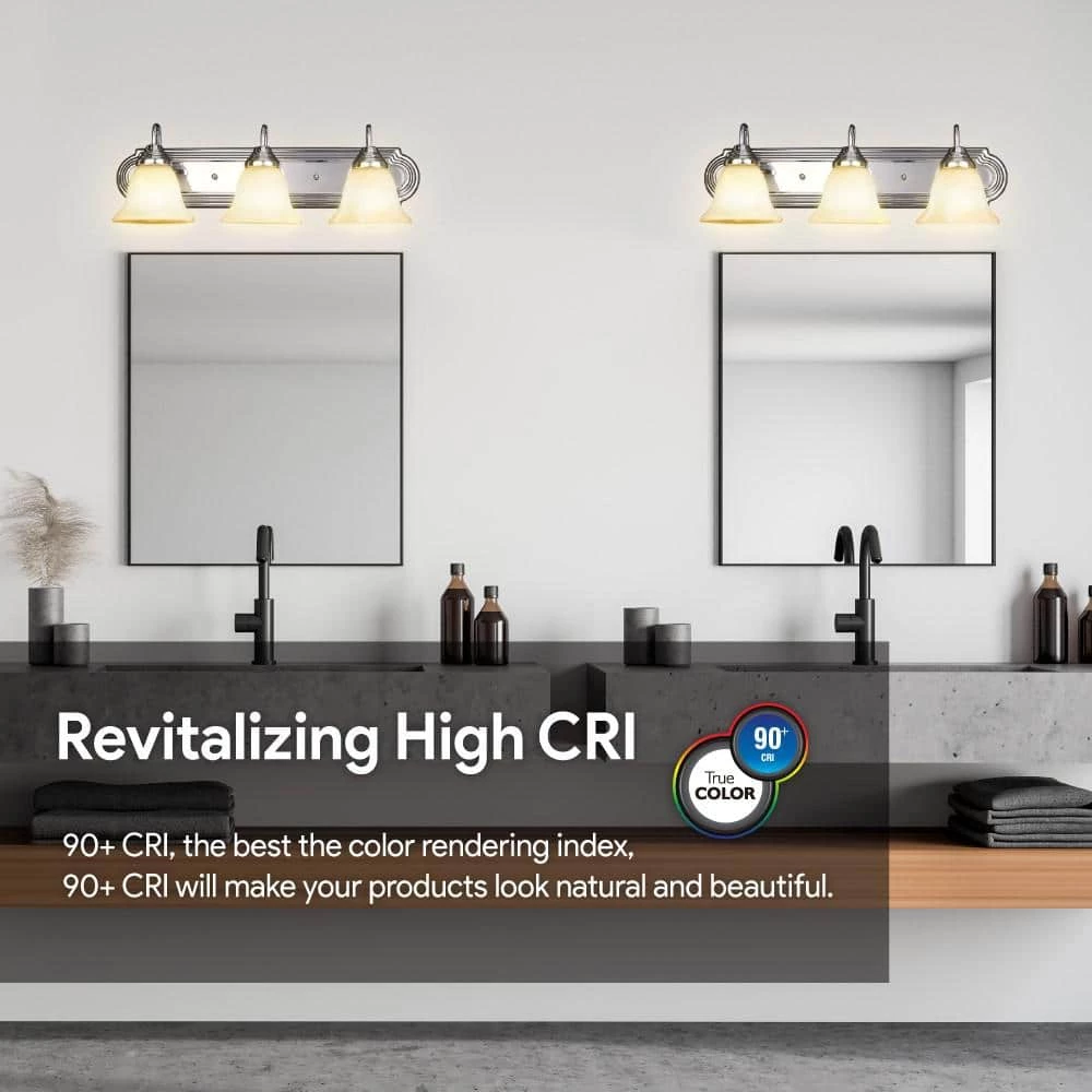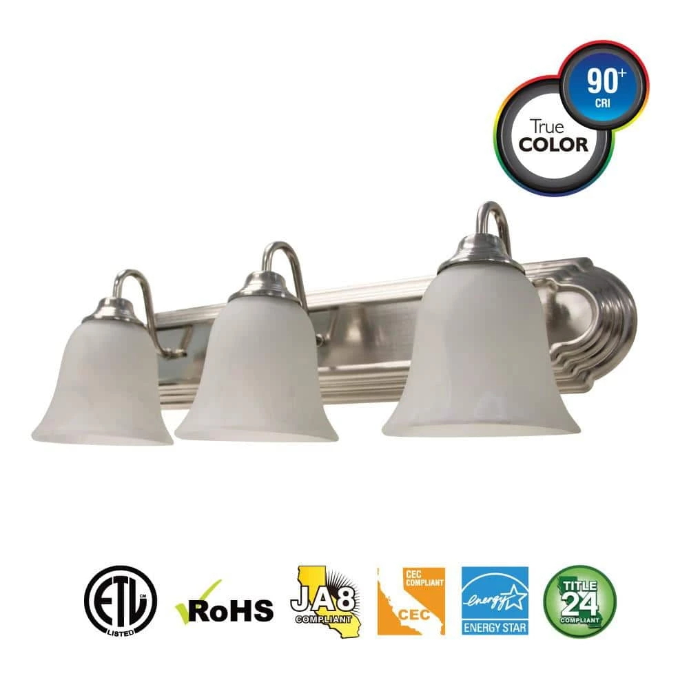 Euri’s decorative bathroom light is an elegant addition to any home. Combining traditional and contemporary style, this 3-light vanity LED casts a bright illumination in Warm White (2700K). Enjoy its elegant alabaster glass bell shades.