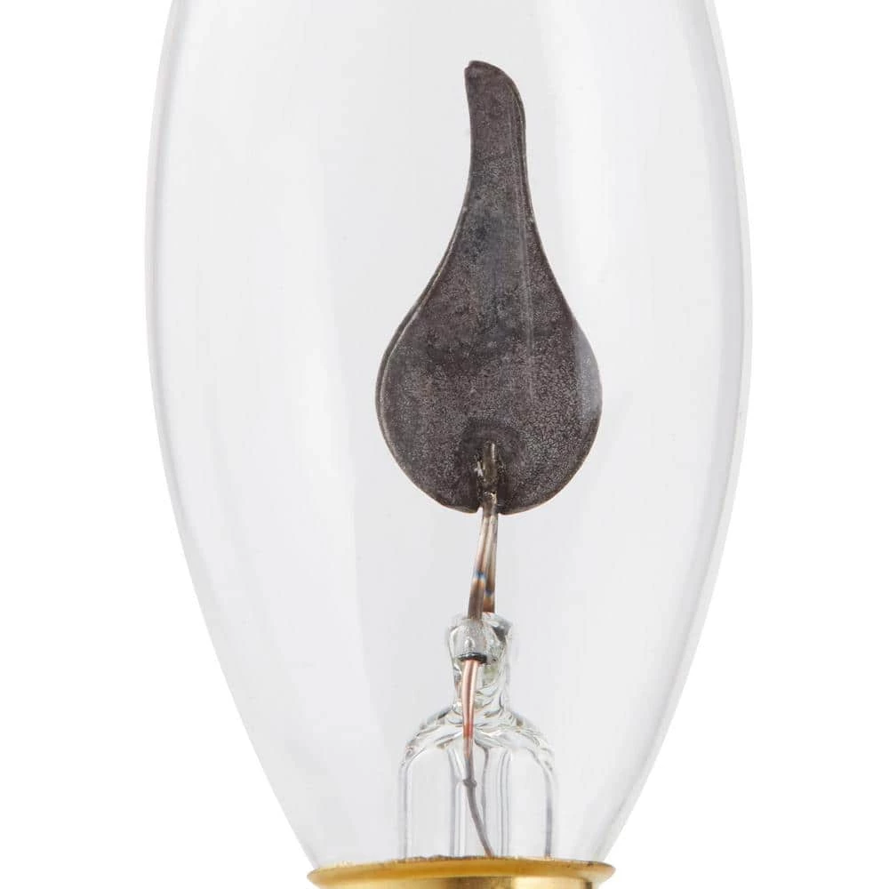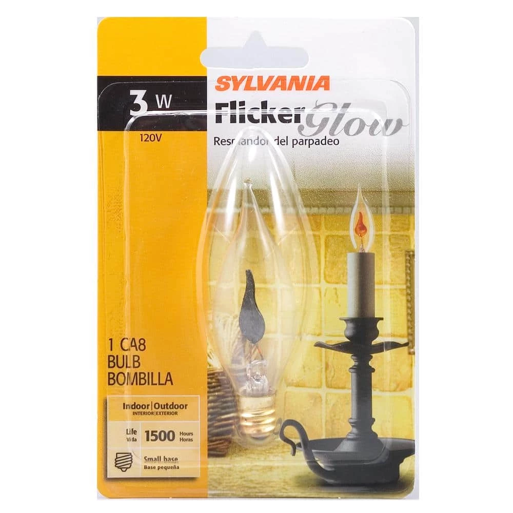 The Sylvania 3-Watt Bent Tip Candelabra Base Clear Flicker Flame Light Bulb provides a flickering light to mimic candle light. It is ideal for use in decorative fixtures. The bulb uses 3-Watt of energy and produces 10 flickering Lumens.