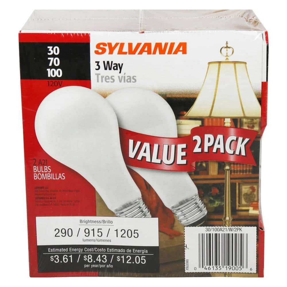 Use the Sylvania 30-70-100-Watt A21 3-Way Incandescent Light Bulb for your kitchen, bedroom, or living room lighting needs. With adjustable, dimmable lumens of 290/915/1205 and soft white light, any area of your home will shine. It averages three hours of usage per day, allowing for energy and cost efficiency.