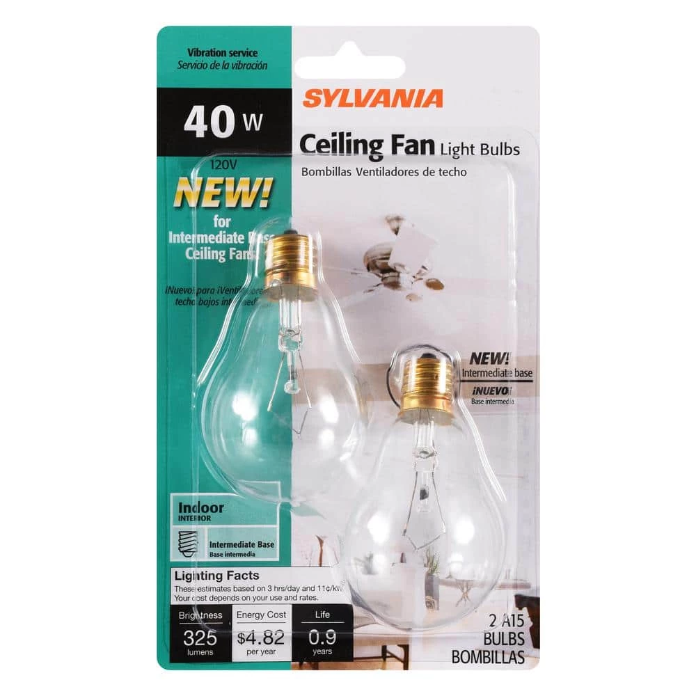 Sylvania 40-Watt Clear A15 Incandescent Intermediate Base bulbs come sold in a 2-pack. This long life bulb last for up to 1.4-year. This bulb is ideal for use in decorative fixtures.