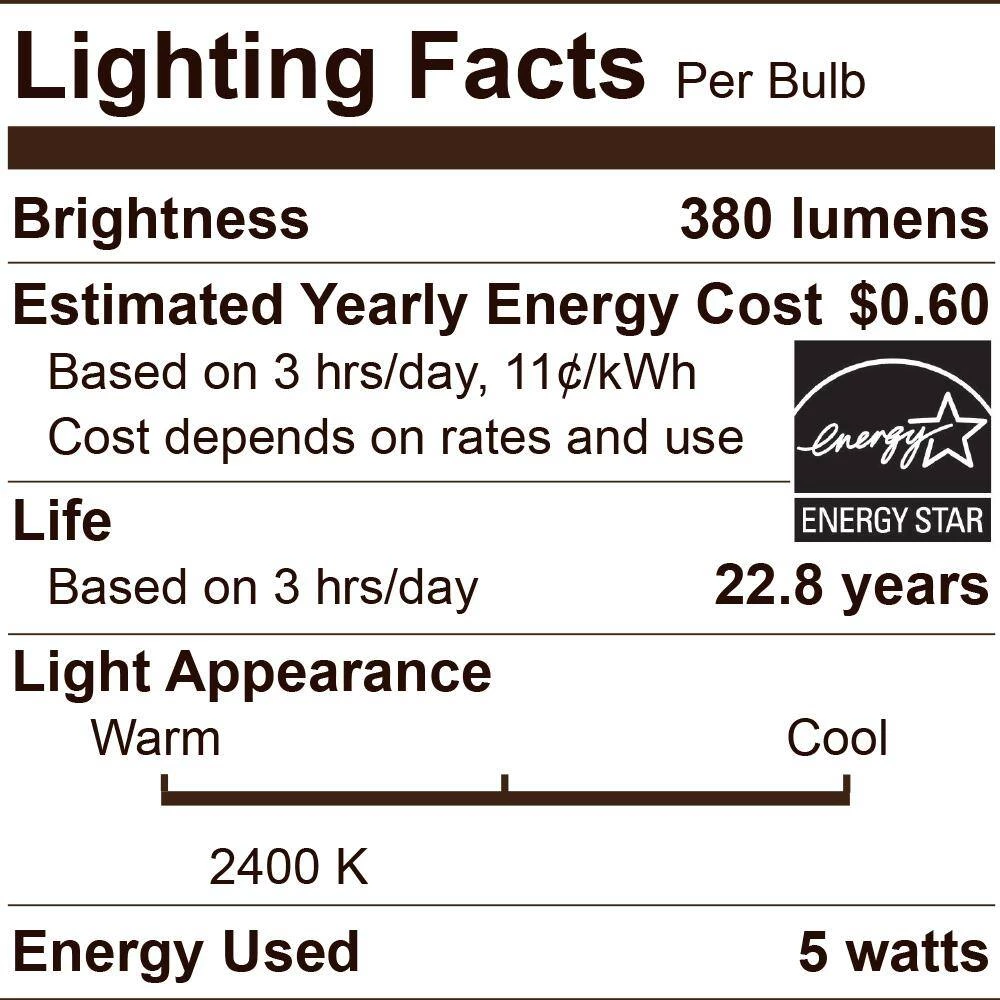 - Energy used: 4.9-Watt (equivalent to a 40-Watt standard incandescent light bulb)