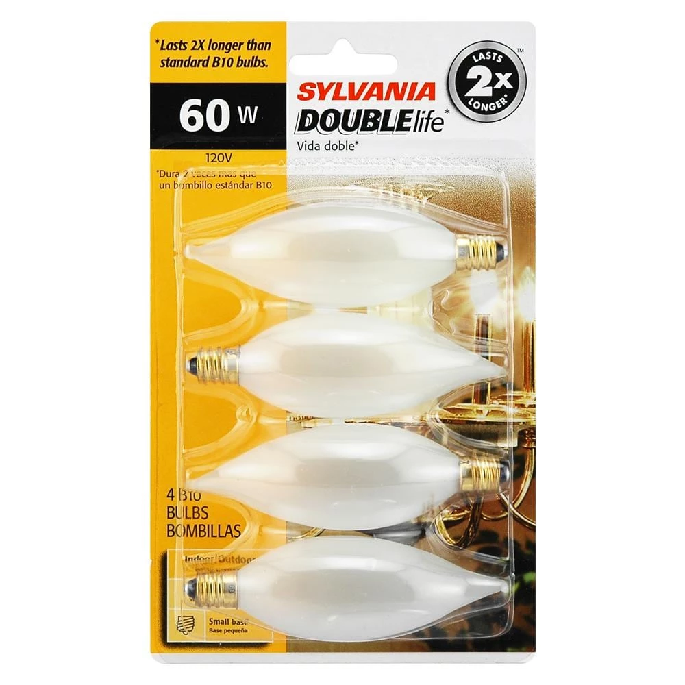 Sylvania 60-Watt Incandescent Bent Tip Frosted Candelabra Base Double Life Light Bulb is sold as a 4-pack. With a brightness of 545-Lumen per lamp, these offer an appealing bright light. Ideal for use in decorative fixtures.