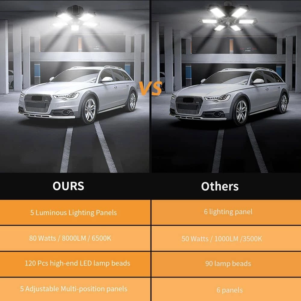 The garage light panel is scientifically designed with efficient heat dissipation. With the 90° adjustable LED panels, the beam angle can be adjusted to spotlight a tight area or to flood a wide area with light covering in 360°. So you can get SUPER bright light at any direction and any venue you need.