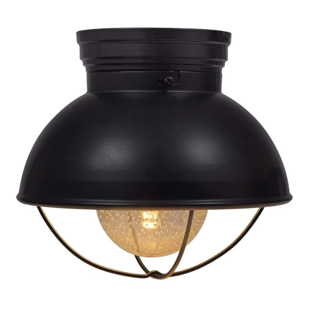 This trendy, antique black, semi-flush mount fixture provides a vintage-inspired option to light kitchens, gathering areas, hallways, and foyers. Similar to designs seen in high-end home furnishing stores and lighting showrooms, this versatile fixture compliments the look of almost any space and pairs nicely with pendant lights. Seeded glass and metal detailing provide for an elegant and classic appearance. Each fixture ships with a highly efficient LED clear A19 filament bulb.