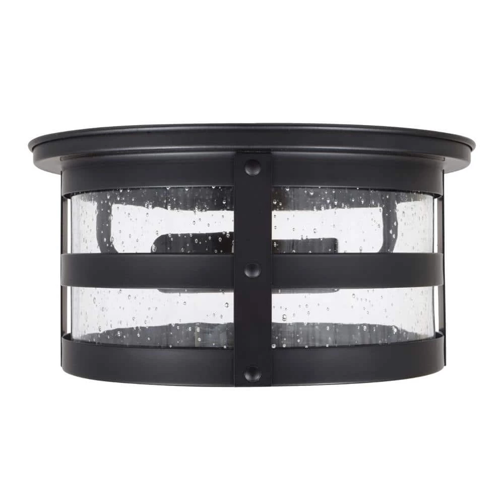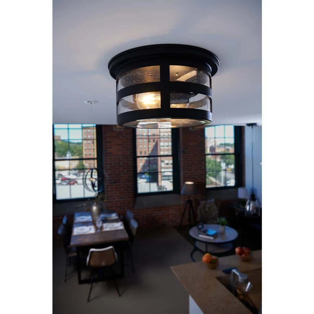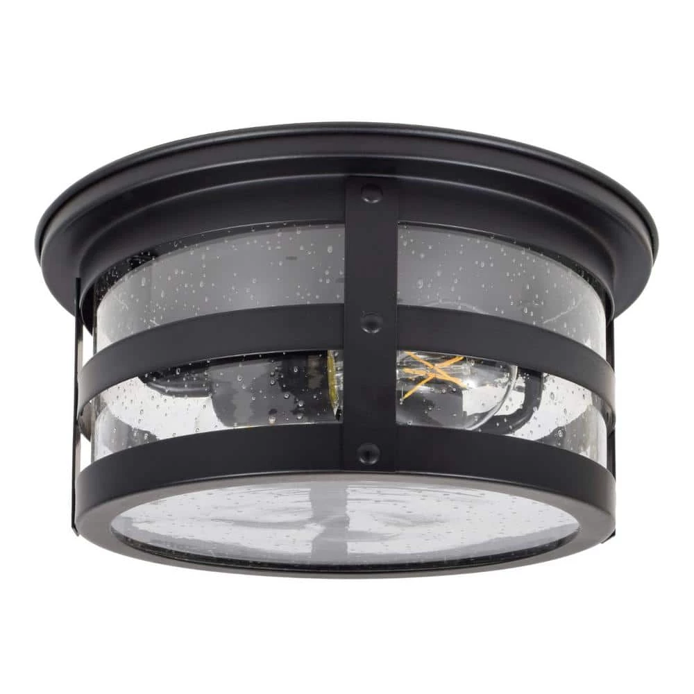 This trendy, antique black, drum-style fixtures provide a vintage-inspired option to light kitchens, gathering areas, hallways, and foyers as well as restaurants and hospitality applications. Similar to designs seen in high-end home furnishing stores, this versatile fixture compliments the look of almost any space and pair nicely with pendant lights. Seeded glass and metal detailing provide for an elegant and classic appearance. Each 11 in. fixture ships with two A19 highly efficient LED clear filament bulbs.