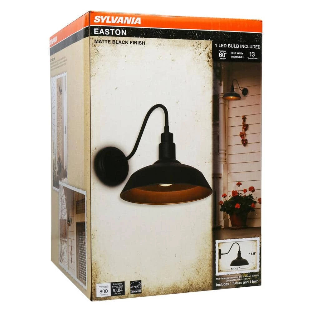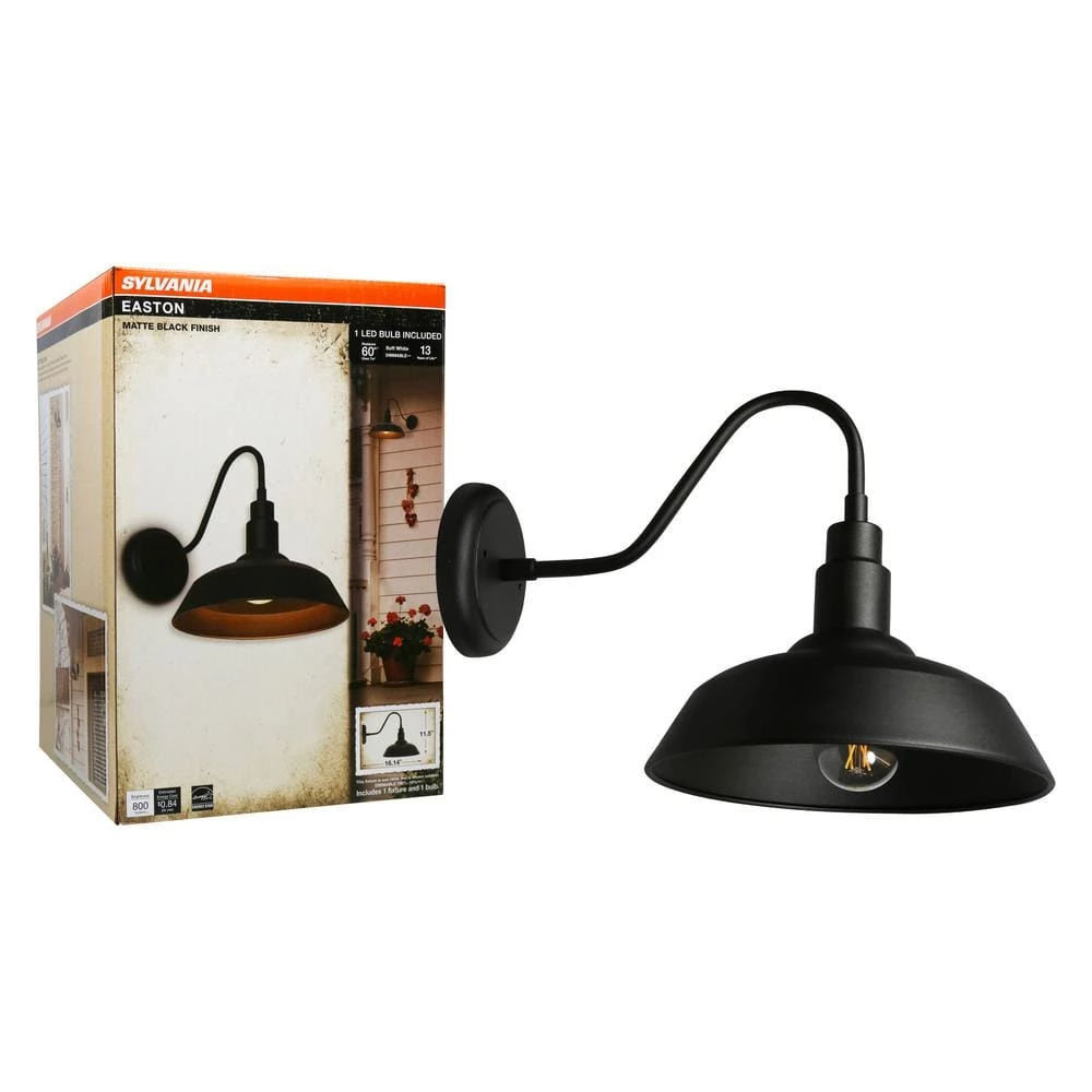 This Easton Single Bulb Outdoor Barn Light Sconce is a stylish, vintage lighting fixture that is the perfect finishing touch you’ve been looking for to be mounted on your indoor and outdoor wall, such as your doorway, porc, or entryway. A metal dome lamp shade that comes in an antique black finish for a subtly classic and elegant effect, this retro piece measures 11.5 in. height and 16.2 in. length. Every purchase comes provided with one highly efficient 6.5-Watt (60-Watt Equivalent) 800 Lumens A19 Filament LED Light Bulb. As a global leader and full-spectrum provider of professional, state-of-the-art, and luminaire LED lights, all of Sylvania’s products focus on catering to the changing moods and needs of their customers.