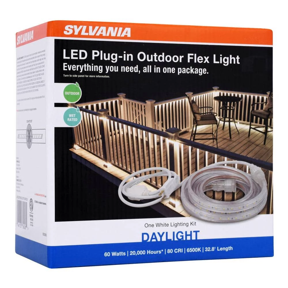 Sylvania LED Plug-In Outdoor Flex Light offers a complete solution for your lighting needs. Suitable for outdoor use year-round. The kit includes strip, AC power cord, clips and screws as well as a full guide to installation. Outdoor LED Flex Kit includes: Strip, power supply, 40 clips, 80 screws.