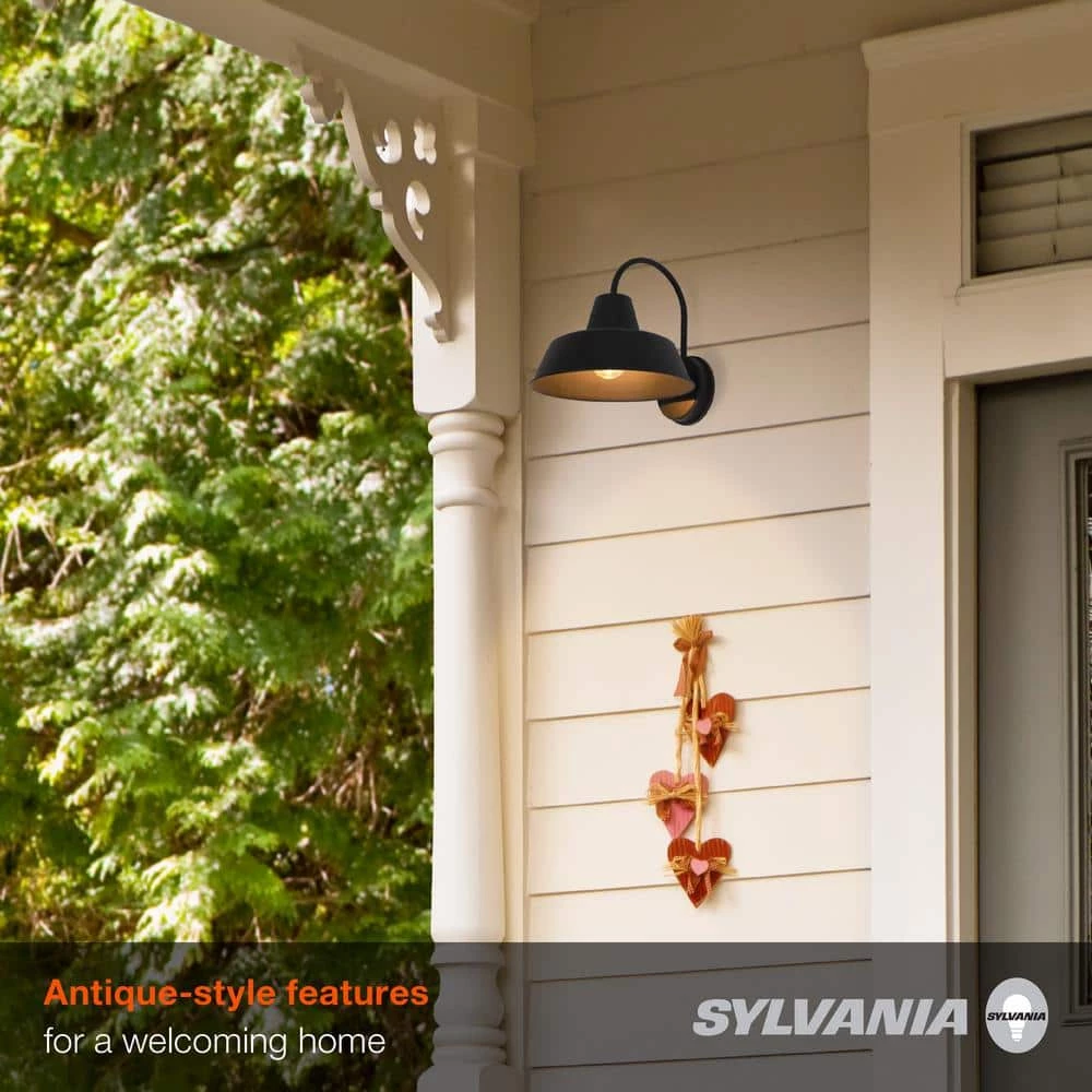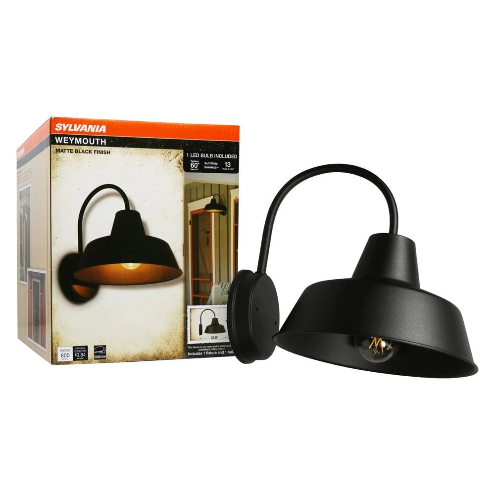 This Weymouth Single Bulb Outdoor Barn Light Sconce is a stylish, vintage lighting fixture that is the perfect finishing touch you’ve been looking for to fit into your home, such as to use as a vintage porch light or outdoor kitchen lighting. A metal dome lamp shade that comes in an antique black finish for a subtly classic and elegant effect, this retro piece measures 11.4 in. height and 12.8 in. length. Every purchase comes provided with one highly efficient Edison 6.5-Watt LED Light Bulb. As a global leader and full-spectrum provider of professional, state-of-the-art, and luminaire LED lighting solutions, all of Sylvania’s fixtures focus on catering to the changing moods and needs of their customers.